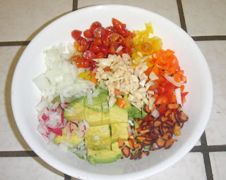 vine ripened tomato,roma tomato, radish, onion, carrot, garlic, garlic chive, broccoli, flax seed, ginger, barbecue sauce, crimini mushroom, jalepeno,rosemary and avocado